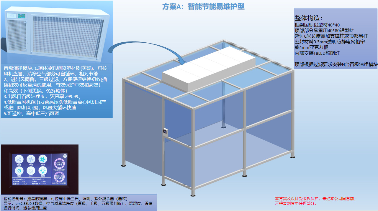 擴(kuò)展性強(qiáng):模塊化結(jié)構(gòu),可通過增加風(fēng)機(jī)過濾單元(FFU)的數(shù)量等方式提高凈化級別,擴(kuò)展性強(qiáng),且重復(fù)利用價值高。