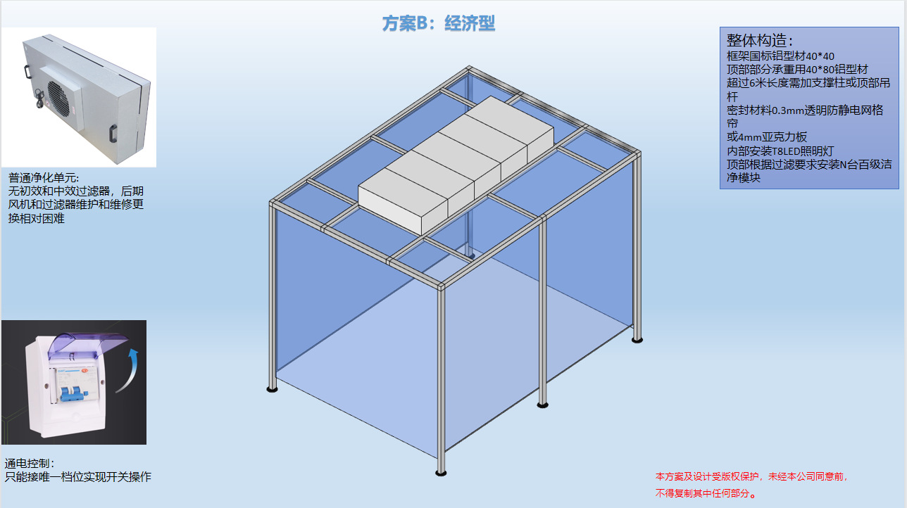 燈具:內(nèi)部采用凈化室專用凈化燈,不產(chǎn)塵,滿足潔凈棚內(nèi)的照明需求。